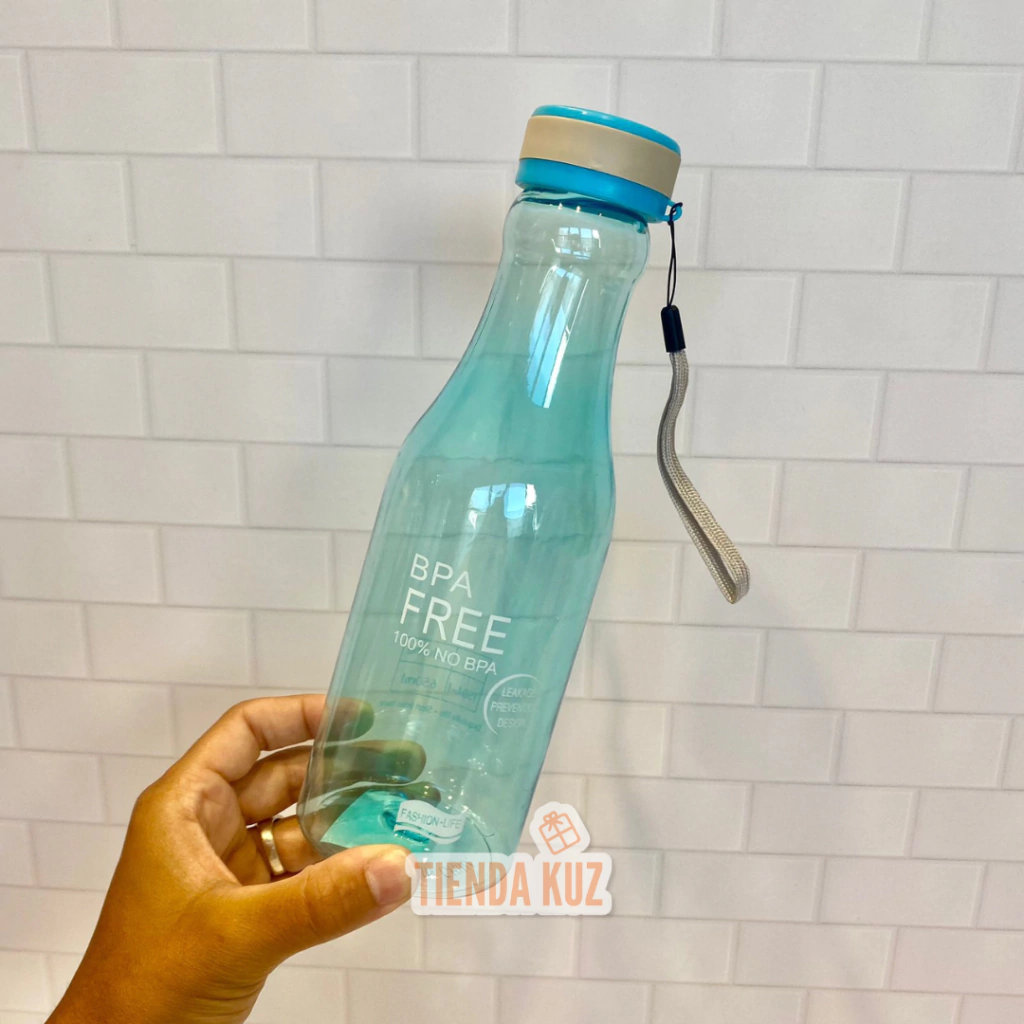 Botella de plástico con tapa a rosca reforzada. Incluye correita de agarre. Libre de BPA. Capacidad: 650ML