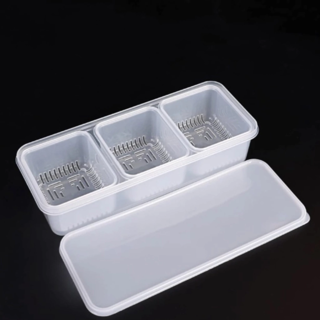 Tupper plástico con tres contenedores dentro, divididos, separados. Cada uno con escurridor propio. Medida total: 23cm de largo x 9,5cm de ancho x 5,5cm de alto