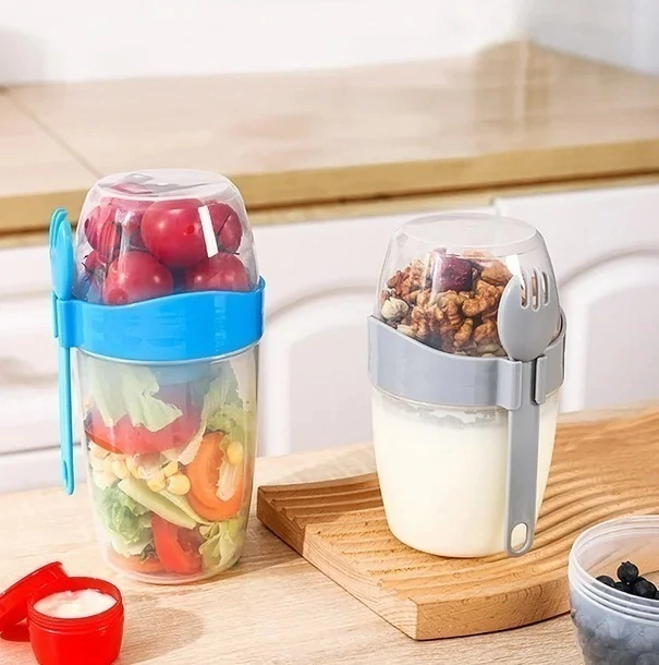 Contenedor doble, ideal para ensaladas o yogurt con frutas, etc. Incluye condimentero. Incluye cubiertito. Material: plástico Medidas: 17cm de alto x 8cm de diám