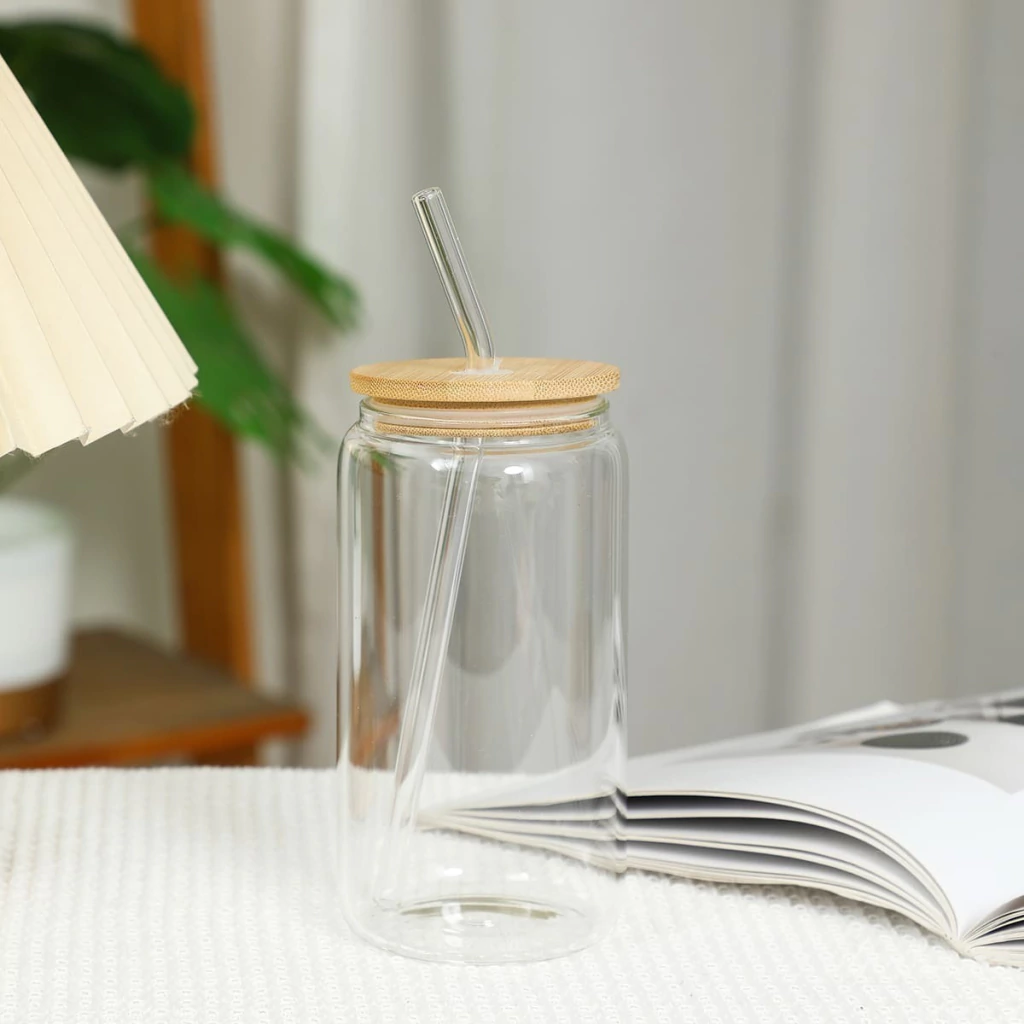 Vaso de vidrio con sorbete también de vidrio y tapa de madera bambú.Capacidad: 500CC