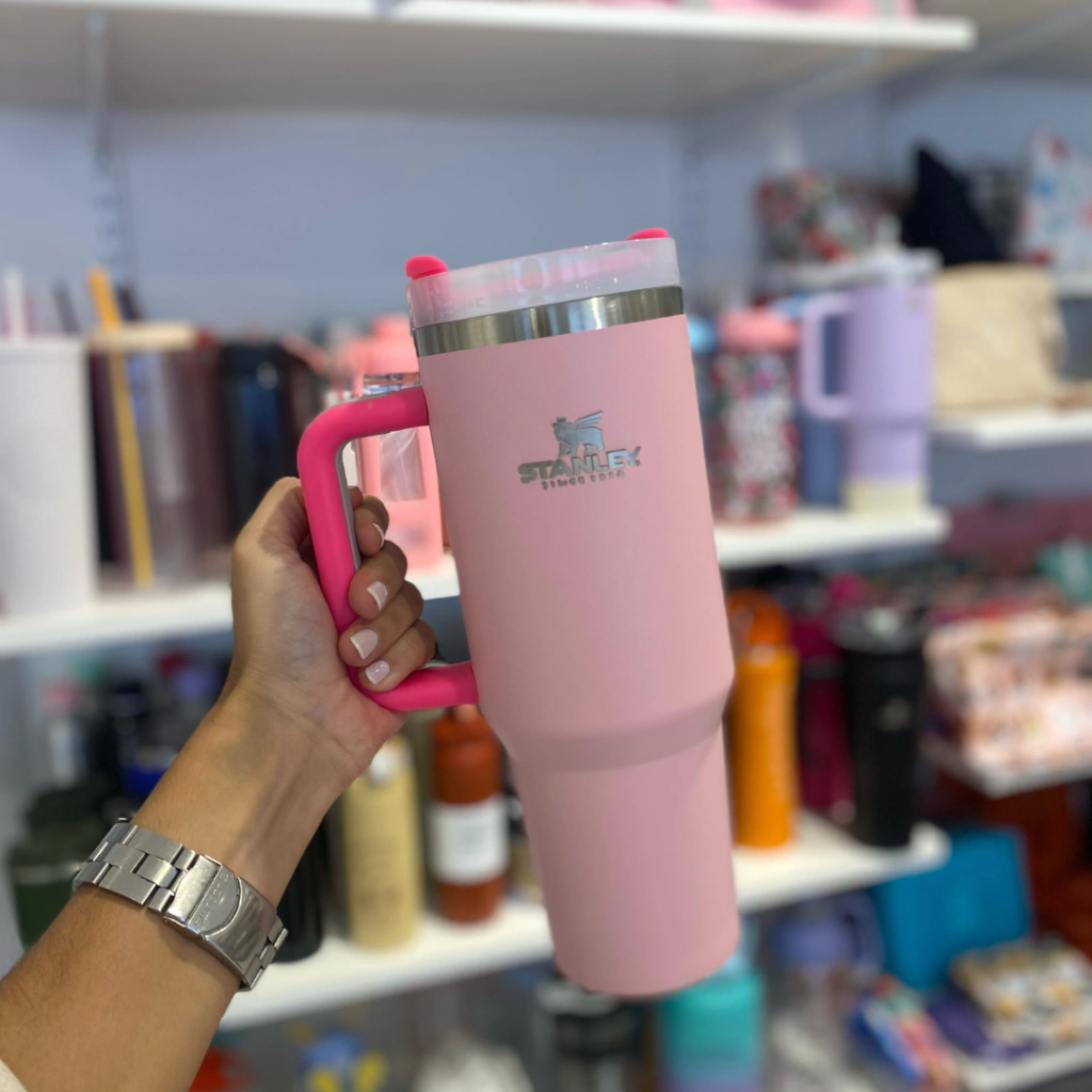 Vaso térmico réplica Stanley, con mango y sorbete plástico.Apto para bebidas frias y calientes. Capacidad: 1,2 litrosMedidas: 25cm de alto aprox